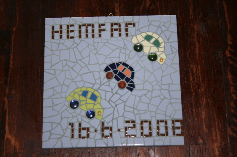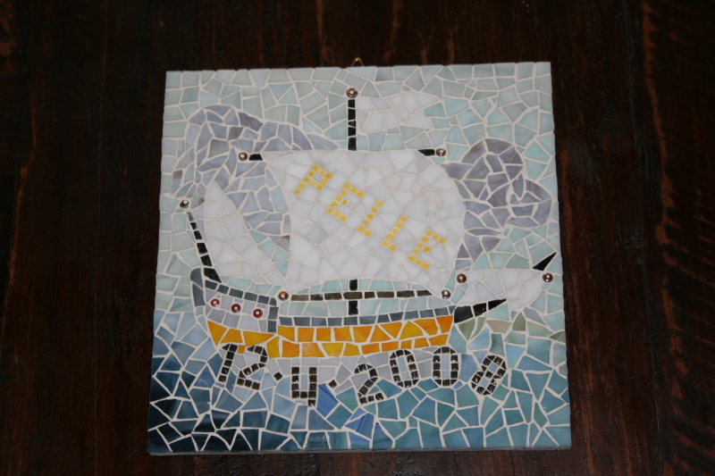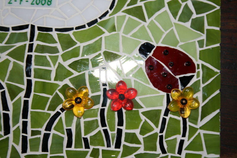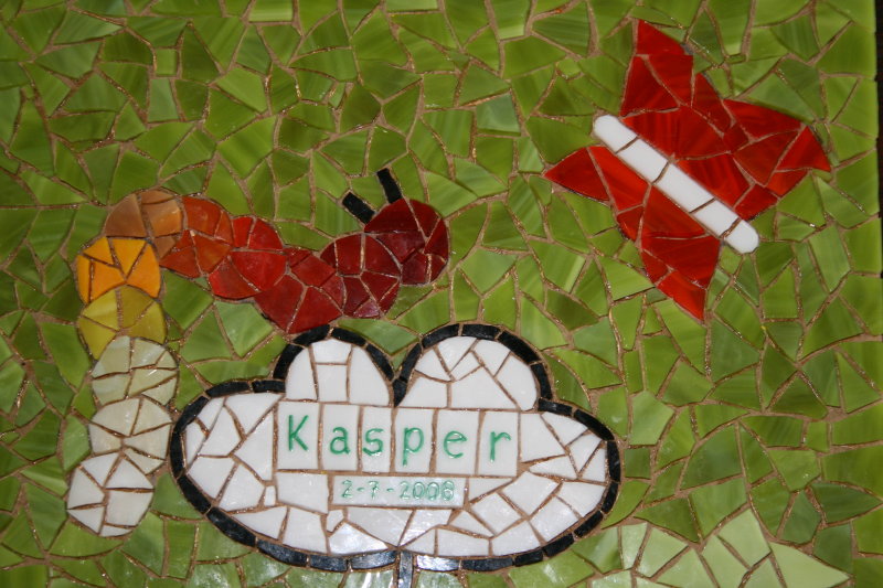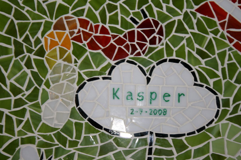 Elk kind heeft zijn of haar naam zelf op het steentje geschreven of getekend. Natuurlijk zijn de steentjes daarna gelakt en afgebakken voordat ze in de mozaïek verwerkt zijn.