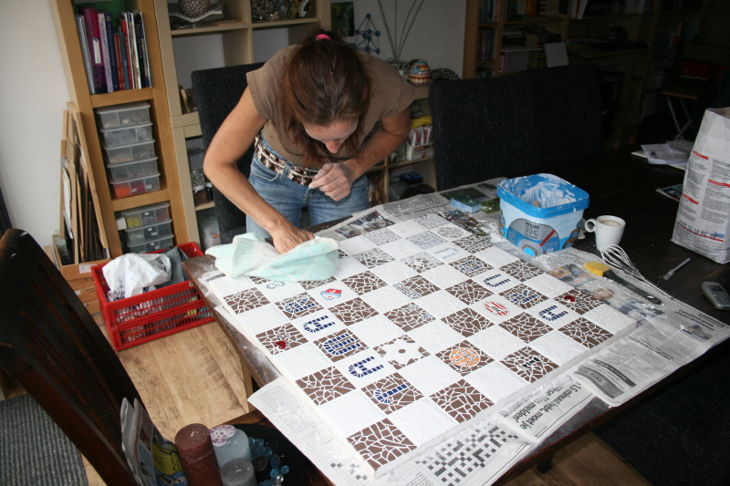 Uiteindelijk zijn de verschillende mozaïek delen op de muur bevestigd en is het werkstuk gevoegd en afgewerkt.