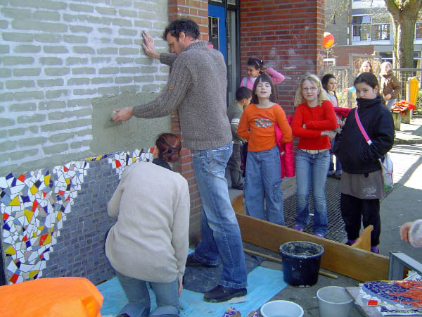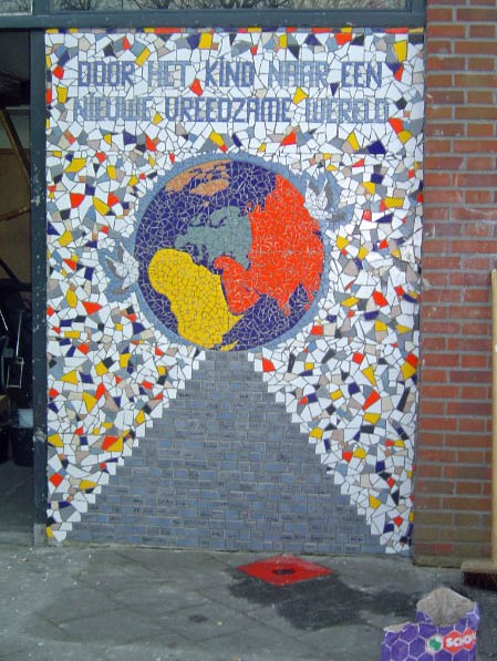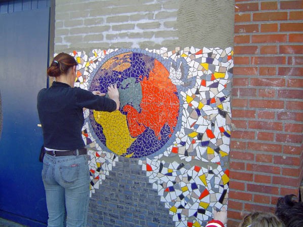 Het is 100 jaar geleden dat Maria Montessori de eerste “Casa dei Bambini” in Rome opende. Dit werd 14 maart 2007 wereldwijd gevierd. De Openbare basisschool Oog in Al afdeling Montessori in Utrecht deed hier natuurlijk ook aan mee. Maar behalve dat er een feestelijke dag werdt georganiseerd heeft de school mij de opdracht gegeven een mozaïek kunstwerk te maken ter ere van dit 100 jarig jubileum. Deze mozaïek heeft een plek gekregen naast de ingang van de school.